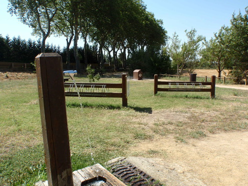 Robinet dans l’aire de repos du canal à Bram (tables et bancs, supports à vélo, panneau d’information, expositions, …) au bord de la Voie Verte du Canal du Midi à Montségur. Proche de la D4 et du pont sur le canal, à 2km du centre de Bram.