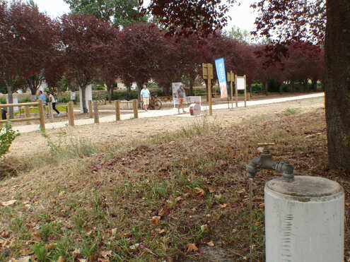 En bordure de la Voie Verte du Canal du Midi à Montségur, sur l’aire de services (tables, bancs, ombre, supports à vélo, halte gonflage en self-service). Toilettes publiques et commerces à 200m.