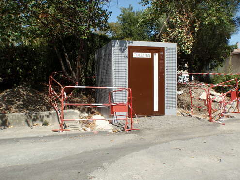 Toilettes publiques (type Decaux) sur la « place Simon », rue du Portail, en face de l’entrée du Parc des Essarts à Bram. Sur le parcours de la Voie Verte du Canal du Midi à Montségur.