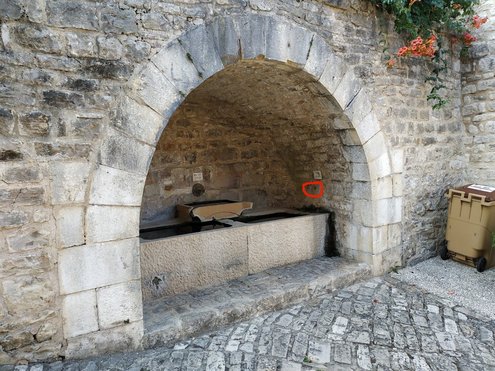 Robinet à droite de la fontaine. Il faut rentrer dans le village médiéval pour atteindre ce robinet d'eau potable. C'est tout près de la fameuse maison de Jeanne, une des plus anciennes maisons du département