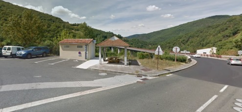 à l'entrée du village, sur la D999, en venant du pont enjambant le Rance à droite, au début du parking