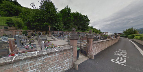 Entrer dans le cimetière, Le robinet est contre le mur de l'église dans le fond du parc.