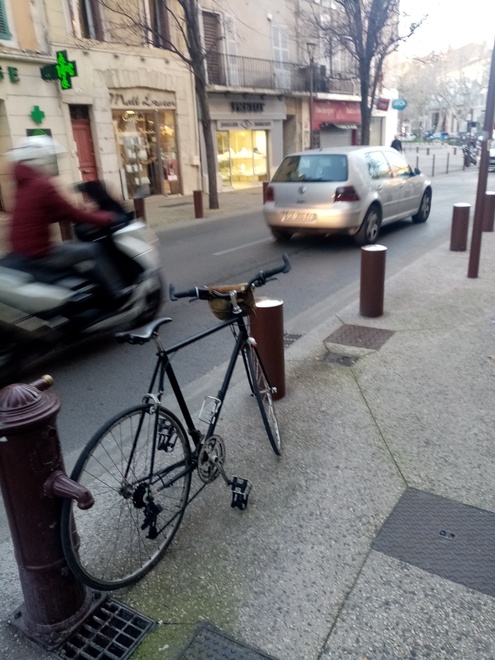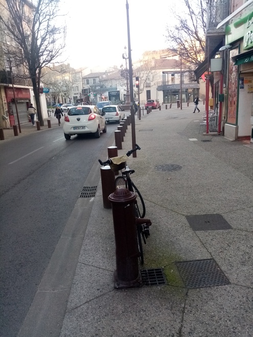En plein centre d'Aubagne sur le coté droit de la D8N dans le sens Cuges MARSEILLE, elle est marron il y a des bornes marron, on la confond presque, de l'autre coté de la rue il y a une autre borne similaire