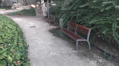 Petite fontaine située entre deux bancs, à l'ouest du Jardin Cardinal Joseph Lefebvre. L'endroit se trouve près de l'intersection des rues Victor Hugo et Jacques Rimbault.