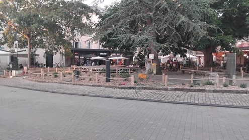 Petite fontaine située sur la place Gordaine, près de l'intersection de celle-ci avec la rue Mirebeau. Des petits poteaux en bois se trouvent à côté de la fontaine.