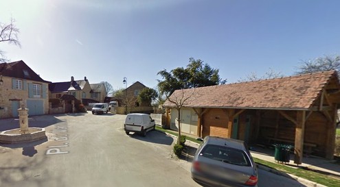 Fontaine au centre de la place de Marchadial. Il y a aussi des toilettes publiques sur la place.