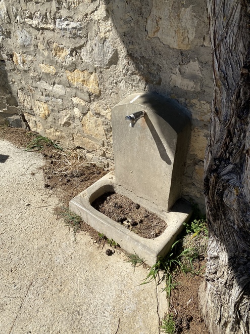 Le point d’eau se trouve contre le mur à droite de l’entrée et d’un cyprès.