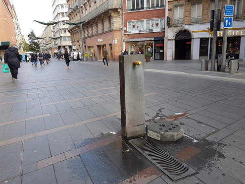 Fontaine au numéro 33 de la rue piétonne rue Alsace-Lorraine, à l’angle rue Baour-Lormian et rue de la Pomme, à proximité de la place du Capitole