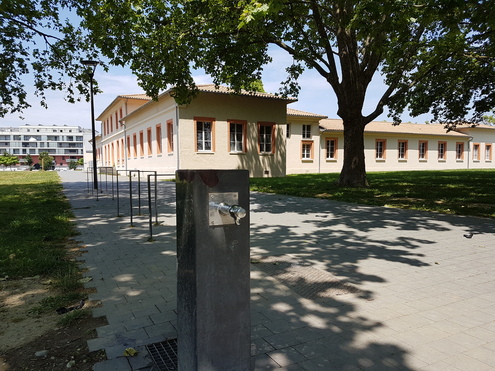 A l’arrière de la Halle de la Machine, et en face du bâtiment de l’Envol des Pionniers (près de la zone ombragée par les grands platanes)