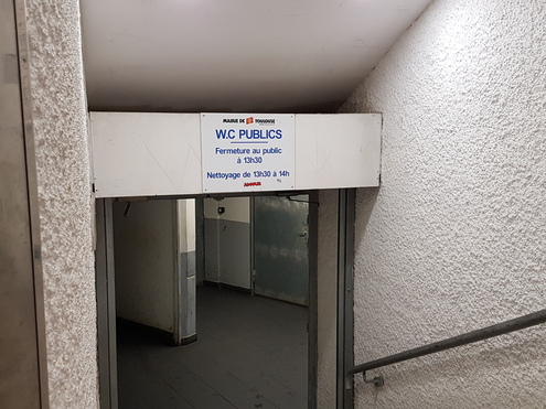 Toilettes publiques du marché couvert de Victor-Hugo à Toulouse, situées dans le marché, à l’angle nord côté Boulevards, en demi sous-sol. Ouvert du mardi au dimanche de 7h30 à 13h30