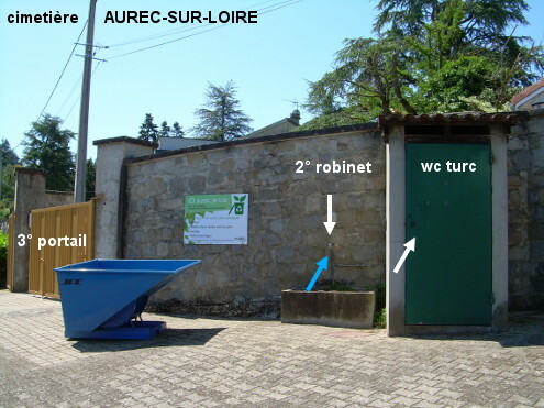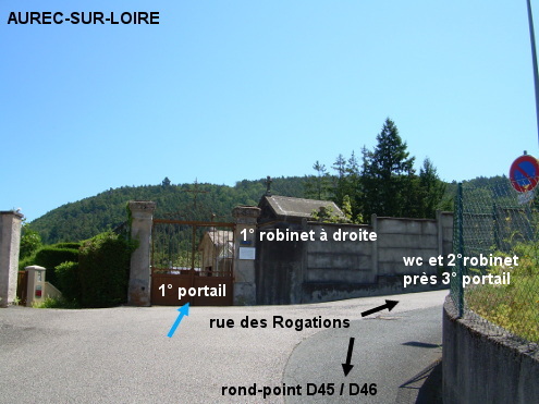 Le cimetière (fléché) est situé dans une rue secondaire débutant au niveau du rond-point D46 / D45. Il comporte un premier robinet à côté du premier portail (à 75 mètres du rond-point), et un deuxième robinet et un WC turc près du troisième portail (à 200 mètres du rond-point). En provenance de Pont-Salomon sur la D45, à son kilomètre zéro sur le rond-point avec la D46, prendre la première sortie en direction du cimetière. Monter jusqu'au premier portail qui nous fait face pour trouver le premier robinet à l'intérieur tout de suite à droite. Si on a besoin d'aller aux toilettes, continuer à monter dans la rue qui a obliqué à droite devant le cimetière, dépasser le deuxième portail, puis sur le replat on arrivera vers le troisième portail. Entrer pour trouver sur la gauche le deuxième robinet au-dessus d'un bassin en pierre (à dix pas) puis la cabine WC turc (la chasse d'eau est opérationnelle).