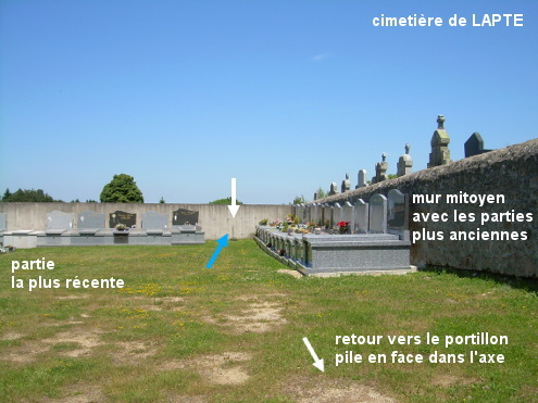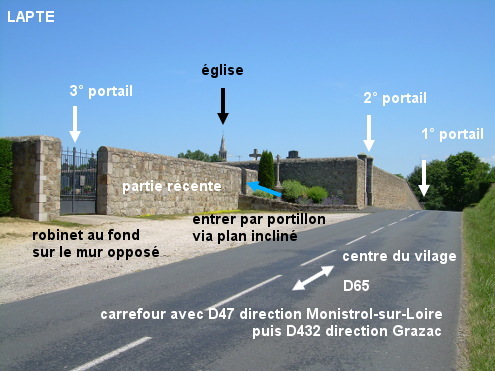 Le cimetière est implanté côté droit à la sortie du village sur la D65 quand on roule en direction de Grazac. Il comporte trois portails, mais apparemment un seul robinet, situé dans la partie la plus récente (celle de gauche) sur le mur opposé au portillon. En provenance de Grazac sur la D432 puis la D65, peu après le début du village on verra le cimetière implanté côté gauche au sommet d'une petite bosse. Entrer par le portillon (il est sur l'extrémité droite de la première partie qui est en retrait par rapport aux suivantes, et donc dans le coin) puis avancer de 40 mètres sur l'allée en herbe jusqu'au mur opposé pour trouver le robinet (N.B. : L'eau gicle sur ce robinet-vanne).