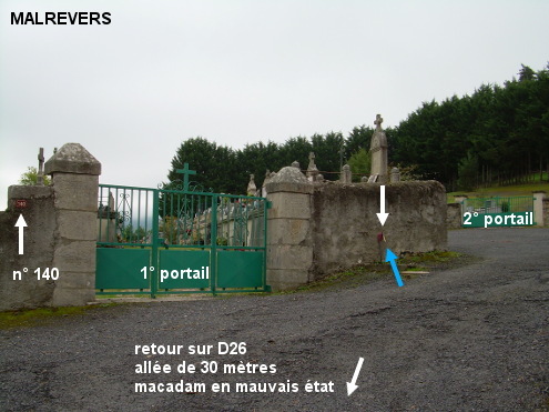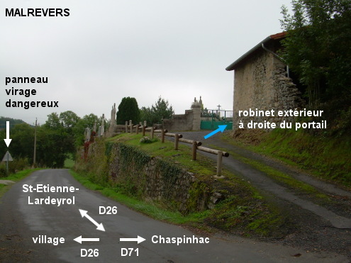 Le cimetière est situé en dehors du village à proximité immédiate de la D26 direction Saint-Étienne-Lardeyrol. 1) En provenance de Chaspinhac sur la D71, juste avant le panneau de début de village dans la D26 en face, tourner à droite dans la D26 direction Saint-Étienne-Lardeyrol. Puis prendre la deuxième à droite qui est une allée oblique de 30 mètres qui monte jusqu'au cimetière (macadam en très mauvais état). Le robinet est à l'extérieur, à droite à trois pas du premier portail, qui porte le numéro 140 (plus loin sur la droite et au fond du cul-de-sac il y a un deuxième portail donnant dans la partie plus récente, mais il n'y a pas de robinet à côté). 2) En venant de Saint-Étienne-Lardeyrol sur la D26, surveiller le côté gauche de la route pour repérer le cimetière en surplomb. Ensuite, tourner en épingle à gauche dans la deuxième allée, entre le panneau implanté côté droit annonçant un virage dangereux et celui annonçant un carrefour type cédez-le-passage. C'est l'allée qui mène au portail du cimetière à côté duquel il y a le robinet.