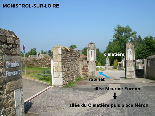 Le cimetière est fléché à partir de la place Néron, grande place en centre-ville située non loin de l'église et du château. 1) En provenance de La Séauve-sur-Semène (sur la D12, environ 1,3 km après le panneau de fin de village là où il y a des flèches D12 face à une route adjacente à gauche, tourner à gauche mais pas en direction des lieux-dits, plus loin on verra d'anciennes flèches montrant qu'il s'agit d'un ancien tracé de la N88, ensuite après le pont enjambant son nouveau tracé tourner à gauche au carrefour en T pour longer la N88, puis au T suivant à droite pour arriver dans Monistrol-sur-Loire, et au rond-point prendre la deuxième sortie direction centre-ville) sur une petite route, aux deuxièmes feux on débouche sur la D47 qui arrive à droite d'Aurec-sur-Loire. Ensuite au rond-point tourner à droite en direction du centre-ville et du cimetière et rouler tout droit jusqu'à voir côté gauche l'énorme fontaine en forme de coupelle qui est au bord de la place Néron. Tourner à gauche puis tourner à droite en direction du cimetière et rouler tout droit jusqu'au fond du cul-de sac (ignorer le portail latéral côté droit, car il n'y a pas de robinet à proximité) où on est face au portail principal grand ouvert du cimetière. On trouvera le robinet à l'intérieur tout de suite à gauche. 2) En provenance de Saint-Maurice-de-Lignon (prendre la D908 en direction du lieu-dit Cublaise puis au carrefour en Y où une flèche à gauche indique la direction du lieu-dit Confolent sur la D461, continuer sur la droite, c'est l'autre partie de la D461) sur la D908 puis la D461 et enfin la D47, rouler toujours tout droit, franchir deux feux tricolores puis au rond-point devant l'Office de Tourisme côté gauche prendre la troisième sortie en direction du centre-ville et du cimetière pour arriver à côté de la place Néron comme au point 1 puis trouver le cimetière. P.S. : Il a un autre portail dans une autre rue, plus compliqué d'accès.