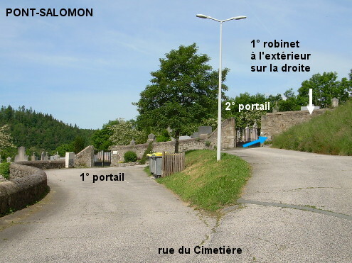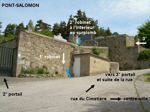 Le cimetière est implanté sur les hauteurs de la ville, dans une rue secondaire. 1) En provenance de Saint-Didier-en-Velay sur la D45, au carrefour en T tourner à droite puis laisser la suite de la D45 qui part à gauche en direction d'Aurec-sur-Loire, pour continuer tout droit en direction du centre-ville. Continuer tout droit en direction de la Z.A. du Gault et franchir le petit pont sur la voie ferrée. Ignorer la rue qui longe la voie ferrée et tourner dans la suivante à droite (rue du Cimetière). Monter alors en direction du cimetière puis tourner à gauche en suivant une deuxième flèche. On arrive plus loin sur un très large replat (avec îlot végétal au milieu) face au cimetière qui comporte trois portails (on ne voit pas le troisième plus haut sur la droite devant lequel passe la rue qui vire à droite et monte à nouveau). 1a) S'approcher du portail du milieu (le deuxième en partant de la gauche) pour découvrir un robinet à l'extérieur à sa droite (et à gauche du cabanon). 1b) En cas de problème sur ce robinet, on peut essayer le deuxième robinet qui est à l'intérieur presque en surplomb du premier robinet. Pour cela, entrer par le portail du milieu, monter dans l'allée en herbe jusqu'à la croix, monter les quatre marches d'escaliers à droite puis une autre marche et revenir ensuite vers le mur avant du cimetière (allée plane) jusqu'au deuxième robinet (à 45 mètres du portail). 2) En provenance de Saint-Ferréol-d'Auroure sur la D6 puis la rue d'Auvergne (en suivant la flèche Pont-Salomon), surveiller le côté gauche de la route pour repérer la flèche ''cimetière'' (première à gauche après début de la ville) et monter jusqu'au cimetière comme au point 1.