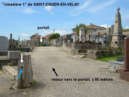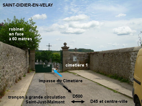 Le cimetière est situé au nord-est de la ville. La première de ses trois parties est facilement accessible depuis la D500 direction Saint-Just-Malmont (il y a une flèche au début de l'impasse). On trouvera son robinet fixé au dos d'une souche d'arbre en avançant de 60 mètres sur l'allée asphaltée. 1) En provenance de Pont-Salomon sur la D45, au stop à l'intersection en centre-ville avec la D500 tourner à gauche en direction de Saint-Just-Malmont. Après le troisième virage, dans lequel il y a un panneau avec des chevrons (et une flèche ''Gendarmerie''), après une rue adjacente à droite en épingle et en sens interdit, tourner à droite en direction du cimetière (la flèche est orientée face au sens opposé). Aller jusqu'au bout de l'impasse (55 mètres), entrer par le portail du ''cimetière 1'' et avancer dans l'allée jusqu'à une souche d'arbre côté droit (à 60 mètres) pour découvrir le robinet fixé de l'autre côté. 2) En cas de problème sur ce premier robinet, pour trouver les robinets des autres parties, dans le virage avec le panneau à chevrons, suivre la flèche Gendarmerie : descendre la courte rue en sens unique et au carrefour en T (deuxième flèche) tourner à gauche (faubourg de la Font, qui débouche sur la D500). Ensuite prendre la branche droite du carrefour en Y (chemin de la Chicane, qui se prolonge en chemin de la Bessonnière). Plus loin on aura le mur du cimetière sur la gauche, monter alors à gauche dans l'allée (quelques mètres en macadam puis terre battue) qui dessert d'abord le ''cimetière 3'' (à 320 mètres de la D500) dont le robinet est à l'intérieur, 10 mètres à droite du portillon, puis le ''cimetière 2'' (50 mètres plus loin) dont le robinet est à l'intérieur tout de suite à droite (attention : il faut d'abord ouvrir la mini vanne avant d'ouvrir le robinet et ne pas oublier de la refermer à la fin).