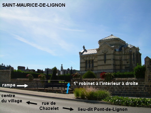 Le cimetière est implanté côté gauche à la sortie nord du village au bord de la rue principale qui le traverse. Il est composé de plusieurs parties, il comporte trois portails et trois robinets. Le robinet le plus facilement accessible est celui qui est à l'intérieur à droite du portail qui donne sur la rue principale, les deux autres donnant sur une voie adjacente. 1) En provenance de Monistrol-sur-Loire sur la D47 (au carrefour avec la bretelle d'accès à la RN88, suivre la direction du lieu-dit Pont-de-Lignon, ne pas prendre la RN88 malgré la direction de Saint-Maurice-de-Lignon !), puis la D461 (jusqu'au lieu-dit Pont-de-Lignon où l'on continue tout droit) et enfin sur la D908 (le numéro figure sur une plaque au ras du sol) en direction de Saint-Maurice-de-Lignon, qui est grosso modo parallèle à la RN88, environ 180 mètres après le panneau de début de village, juste après le panneau ''zone 30'', s'arrêter pour entrer dans la première partie du cimetière implanté côté droit (il y a une grande chapelle à l'intérieur). On trouvera le premier robinet à droite du portail (N.B. : L'eau gicle sur ce robinet-vanne). 2) En provenance d'Yssingeaux (dans le centre-ville prendre la D988 puis au premier rond-point prendre à gauche un bout de D105 en direction de Saint-Maurice-de-Lignon, ensuite au deuxième rond-point prendre la première sortie en direction du lieu-dit Alinhac) sur la petite route passant par le lieu-dit Alinhac et grosso modo parallèle à la N88, traverser presque tout le village. Juste après le mini rond-point plat il y a côté gauche un grand parking puis le cimetière derrière la voie adjacente. On voit alors face à soi l'un des deux portails donnant dans cette voie (en cul-de-sac). 2a) Si l'on entre par ce portail (à 10 mètres de la route), on trouvera un robinet à 11 mètres sur la droite (allée en herbe) sur le mur entre deux sépultures et juste avant le coin. 2b) En cas de souci, on peut chercher le troisième robinet : entrer par le dernier portail (à 45 mètres de la route) et se diriger vers la droite (allée en herbe) pour trouver ce robinet sur le mur mitoyen (à 20 mètres du dernier portail).
