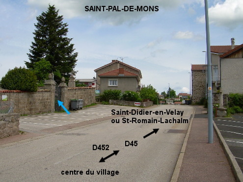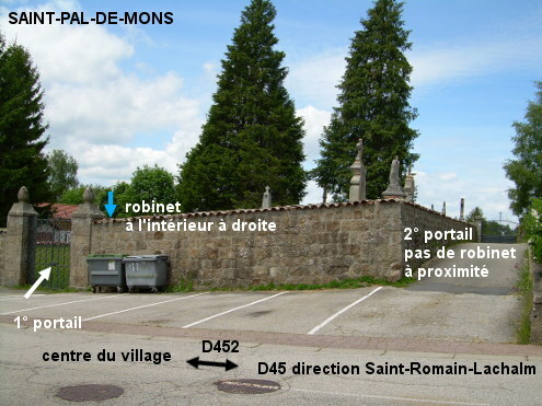 Le cimetière est implanté au bord de la D452 en périphérie du centre du village. Le robinet est à l'intérieur du cimetière, à droite du portail de gauche (celui qui est le plus près de la route). 1) En provenance de Saint-Romain-Lachalm sur la D45 puis la D452, peu après le début du village, le cimetière est implanté côté droit, en retrait derrière un parking. Il comporte deux portails : le portail de gauche devant lequel est aménagé le parking donne dans une partie dotée d'un robinet à l'intérieur tout de suite à droite du portail (à côté d'une ancienne borne Bayard), le portail de droite au bout d'une allée donne dans une partie sans robinet à proximité. 2) En provenance de Montfaucon-en-Velay sur la D500, tourner à droite dans la D452 en suivant la direction de Saint-Romain-Lachalm puis au carrefour en T tourner à gauche (c'est la suite de la D452, à droite le centre du village). Peu après on arrivera vers le cimetière implanté côté gauche.