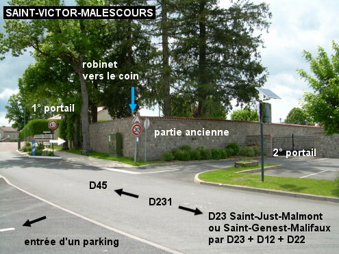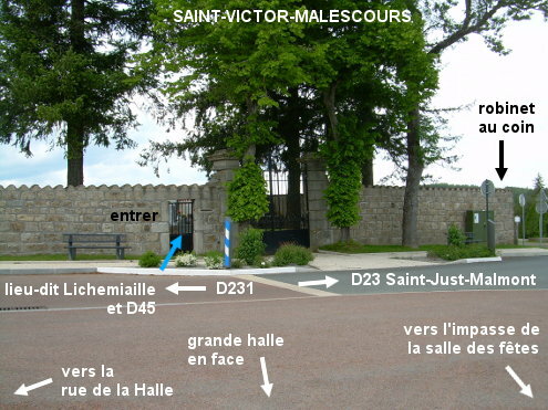 Le cimetière est implanté côté gauche à la sortie du village sur la D231 quand on roule en direction de Saint-Genest-Malifaux. Le robinet se trouve dans le coin avant droit de la partie de gauche située au bord de la route. En provenance du lieu-dit Lichemiaille sur la D231, surveiller le côté gauche de la route pour repérer le cimetière derrière une rue adjacente à gauche dans le carrefour multi-branches situé à côté de la salle polyvalente et sa grande halle. Il comporte deux parties, la première à gauche est la plus ancienne, la deuxième à droite et en retrait derrière un parking est plus récente. Entrer par le portillon qui est à côté du portail donnant directement sur le trottoir au bord de la route. Se diriger vers le coin à droite (allée gravillonnée de 15 mètres) pour trouver le robinet. N.B. Il n'y a actuellement pas de robinet dans la partie récente (encore presque vide, en mai 2025).