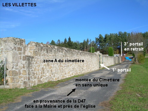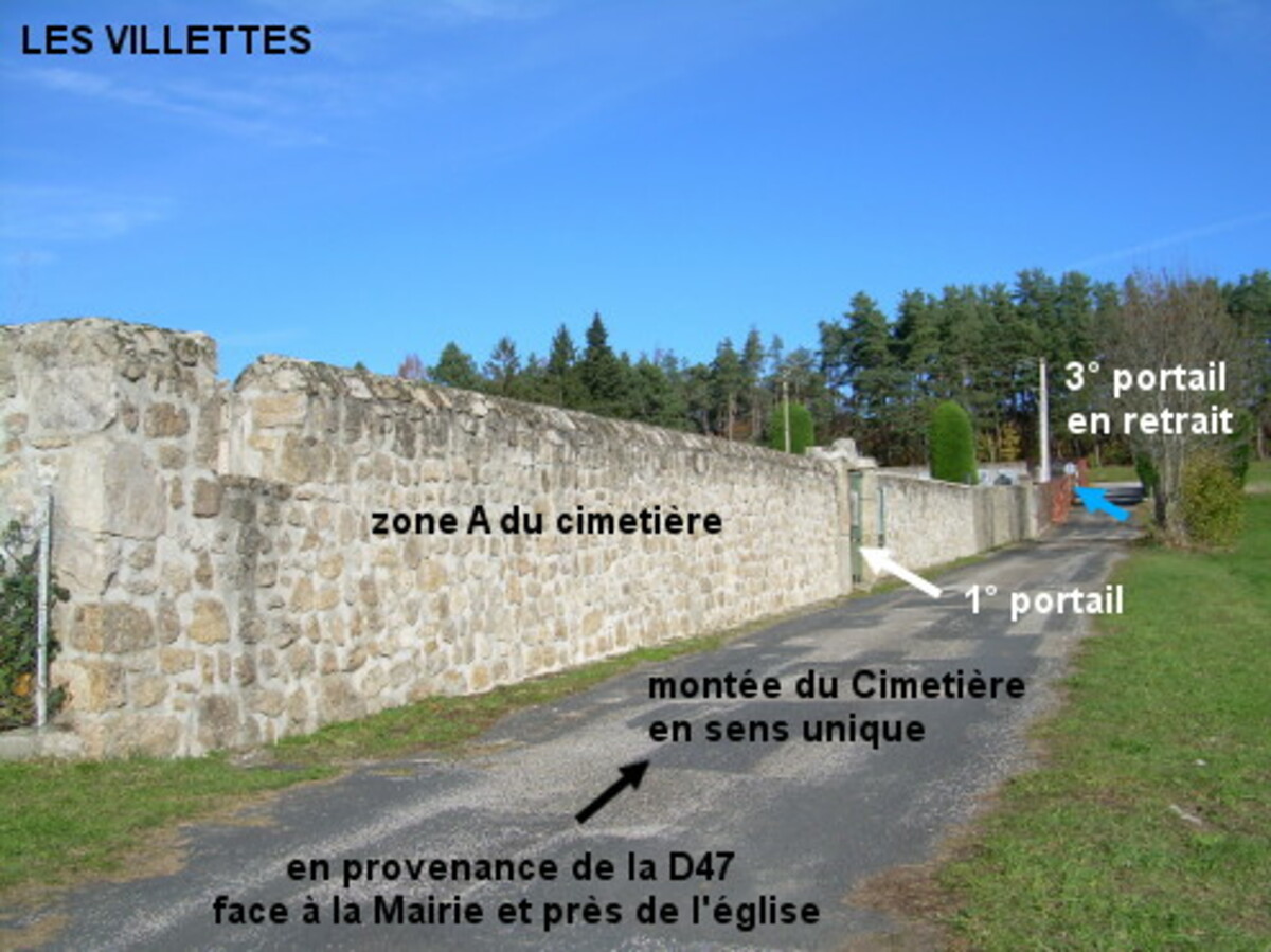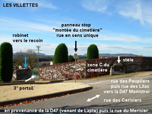 Le cimetière est situé à l'angle de deux rues secondaires, dont l'une est la rue en sens unique qui débute en face de la Mairie sise à côté de la D47. Le robinet se trouve dans la ''zone C'' du cimetière (cf plan du cimetière sur place) qui est la partie la plus à droite. 1a) En provenance de Lapte sur la D47 (celle-ci se superpose pendant plusieurs kilomètres à la D43 direction Sainte-Sigolène), après le panneau de début de village tourner dans la deuxième à droite (rue du Merisier qui se prolonge en rue des Acacias, puis en rue des Cerisiers après le stop). Rouler tout droit puis après le carrefour avec un stop, derrière la deuxième rue adjacente à gauche (à 815 mètres de la D47) on verra une stèle devant le coin du cimetière. Le portail de la zone C (dans laquelle il y a le robinet) en retrait par rapport au mur du cimetière, est celui qui est à 20 mètres de la route sur laquelle on roule. On peut rejoindre sans soucis ce portail, le sens interdit ne débute qu'après. Le robinet est à l'intérieur sur la gauche vers le recoin. P.S. : En continuant dans la rue des Peupliers qui à partir du côté du cimetière fait suite à la rue des Cerisiers, on rejoindra la D47 au deuxième stop. 1b) Si on a loupé la rue du Merisier, il suffira de tourner dans la première à droite après l'église : la rue en sens unique ''montée du Cimetière'', qui est en face de la Mairie sise côté gauche en retrait par rapport à la D47. Le cimetière est implanté côté gauche un peu plus haut, continuer à monter jusqu'au troisième portail (à 160 mètres de la D47) pour trouver le robinet à l'intérieur à sa gauche. 2a) En provenance de Monistrol-sur-Loire sur la D47, après le panneau de début de village, tourner dans la première à gauche sur un embranchement en Y (rue des Lilas qui après le stop se prolonge en rue des Peupliers). Puis rouler tout droit pendant 460 mètres, on sera alors à l'angle avec la ''montée du Cimetière'' côté droit. Descendre à droite jusqu'au portail le plus proche et entrer pour trouver le robinet à sa gauche. 2b) Si on a loupé la rue des Lilas, il suffira de tourner à gauche dans la montée du Cimetière qui est presque en face de la Mairie sise côté droit juste après.