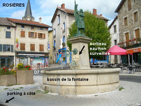 La fontaine est située sur une place sise au bord de la D7 en plein centre-ville. 1) Sur la D7 en provenance de Beaulieu, après le rond-point avec la D71 venant à droite de Malrevers, après la Mairie sise côté gauche, on arrivera vers une longue place avec parking côté droit entre deux rues adjacentes. La fontaine est située à la fin de cette place, juste avant la deuxième rue adjacente (en sens interdit). Elle s'écoule dans un grand bassin circulaire en pierre et est accompagnée d'un écriteau ''eau non surveillée''. 2) Sur la D7 en provenance d'Yssingeaux (prendre d'abord la D103 en direction de Retournac puis après le pont au-dessus de la RN88 et le rond-point, ne pas suivre ''Rosières'' mais tourner à gauche dans la D7 en direction du lieu-dit Vaunac), peu après le carrefour à gauche avec la D35 partant en direction du Pertuis, on arrivera vers la place sise côté gauche au début de laquelle il y a la fontaine. 3) Sur la D35 en provenance du Pertuis et du lieu-dit Lachaud-de-Rougeac, face au sens interdit suivre le sens obligatoire à gauche (flèche ''toutes directions'') puis après une série d'emplacements de stationnement, tourner à droite. On débouchera alors en T sur la D7 avec la fontaine dans l'angle à gauche, dont l'écoulement fait face à la longue place sise côté gauche.