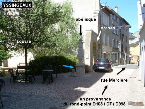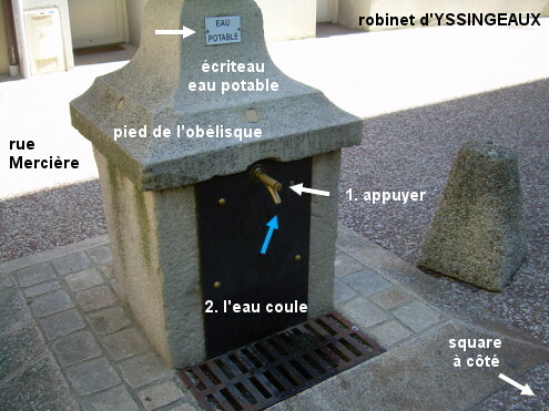 Le robinet est fixé sur une sorte d'obélisque à côté d'un square dans l'hypercentre, à 40 mètres du rond-point D103 / D7 / D988. Il est surmonté d'un écriteau ''eau potable''. En provenance de Tence sur la D103, au rond-point avec la D988 et la D7, prendre la deuxième sortie pour rentrer dans l'hypercentre puis aussitôt la branche gauche du Y. Quelques mètres après, on verra côté gauche une sorte d'obélisque à côté d'un square. Sur le côté de l'obélisque faisant face au square (donc opposé à la rue) on découvrira l'ancien robinet en laiton (quand on appuie sur le bouton, l'eau coule sans gicler). P.S. : En continuant dans la rue, celle-ci vire à droite et débouche à côté de l'Office de Tourisme près duquel il y a un ''point accueil vélo'' et des toilettes. Et si on prend la rue Saint-Antoine à gauche, elle débouche sur la D76 sur l'anneau qui fait le tour de l'hypercentre en sens unique antihoraire.