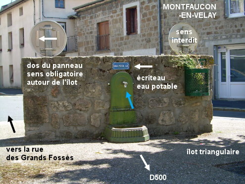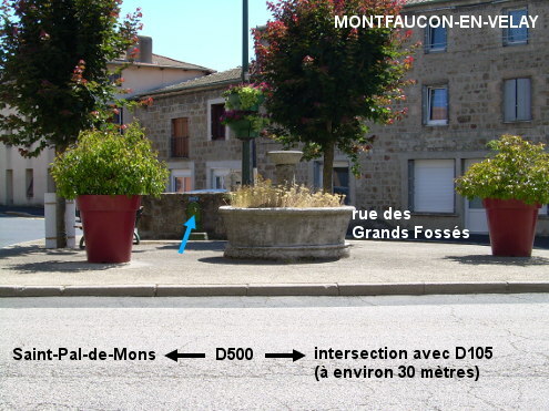 Le robinet se trouve sur un grand îlot triangulaire arboré au carrefour d'une rue adjacente à la D500 situé près de son intersection avec la D105. Il est surmonté d'un écriteau bleu ''eau potable''. 1) Sur la D500 en provenance de Saint-Pal-de-Mons, environ 30 mètres avant l'intersection avec la D105, traverser à gauche pour rejoindre l'îlot au fond duquel il y a le robinet au-dessus d'une vasque verte accolée à un pan de mur en pierres. N.B. : Sur cet îlot, il y a deux arbres, le gros bassin d'une ancienne fontaine au bord de la D500 et deux gros pots de fleurs. 2) En venant de Dunières sur la D23 puis la D501 et enfin la D105, traverser une grande partie du centre-ville et à l'intersection avec la D105, tourner à droite dans la D500 et s'arrêter peu après et monter sur le grand îlot avec deux arbres qui est dans la fourche avec la rue adjacente à droite, pour trouver le robinet.