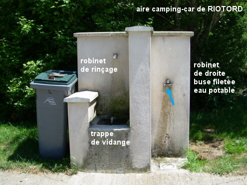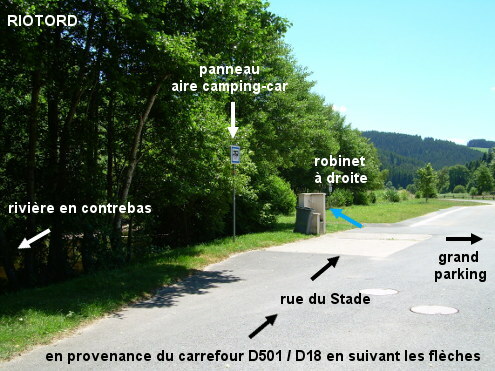 L'aire pour camping-car est située dans une rue secondaire et son itinéraire d'accès est fléché à partir du carrefour D501 / D18. 1) En provenance de Marlhes sur la D501, tourner à gauche (la flèche D18 est orientée face au sens opposé) en suivant la flèche de l'aire pour camping-car (en bas d'une série, dont la flèche ''Mairie'') puis tourner aussitôt à droite : cette flèche est décalée sur la droite après le triangle engazonné. Au carrefour plus loin continuer tout droit en suivant la flèche et le sens obligatoire autour des terrains de sports puis au carrefour en T tourner à droite toujours en suivant la flèche. On arrivera un peu plus loin en vue du bloc ciment de l'aire service pour camping-car implantée côté gauche au début de l'immense parking situé à droite (à 425 mètres de la D18). N.B. : Il faut utiliser le robinet dont la buse est filetée (pour raccord au tuyau destiné au remplissage des cuves de camping-car, et qui délivre donc de l'eau potable) qui est à droite de la séparation en ciment (l'autre robinet au-dessus de la trappe de vidange sert en effet au rinçage des cassettes wc). Sous le robinet de droite il y a une plaque métallique percée d'un trou suffisamment grand pour que l'on puisse y passer le goulot de la plupart des bidons et donc l'approcher au plus près de la buse d'écoulement. P.S. : Pour retourner sur la D18, faire demi-tour, rouler tout droit jusqu'au carrefour en T puis tourner à droite pour déboucher un peu plus loin sur la D18 (à 360 mètres du robinet). 2) En provenance de Saint-Julien-Molhesabate sur la D18, après le carrefour à droite avec la D184 venant du lieu-dit Les Sétoux tourner dans la rue perpendiculaire à gauche (derrière le triangle engazonné) : c'est la rue du Stade, et l'on verra une flèche de l'aire pour camping-car sur le premier bâtiment côté gauche. Suivre alors les flèches comme au point 1.