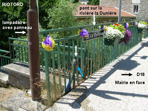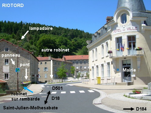 Ce robinet est fixé sur la rambarde du pont sur la rivière, situé en face de la Mairie (fléchée) qui est à côté du carrefour D18 / D184. 1) Sur la D18 en provenance de Saint-Julien-Molhesabate, la Mairie est sise côté droit derrière le carrefour avec la D184 venant de Vanosc. À cet endroit côté gauche on verra la rambarde du pont sur la rivière. Le robinet, près du sol, est fixé au début de la rambarde, à côté du lampadaire supportant un panneau carré bleu de Voie Verte (en rapport avec la partie piétonne de la rue du Pont en face à gauche), et presque sous la plaque marine portant le nom de la rivière ''la Dunière''. 2) En provenance de Marlhes sur la D501, tourner à gauche en direction de la Mairie (la flèche D18 est orientée face au sens opposé). Quelques mètres après, on arrivera à côté de la rambarde du pont. Avancer jusqu'à la fin du pont pour trouver le robinet à côté du poteau du lampadaire.