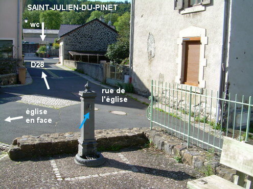 Le robinet se trouve dans un recoin situé face à l'église, à 50 mètres de la D28. 1) En provenance de Saint-Étienne-Lardeyrol sur la D43 (suivre d'abord la direction du lieu-dit Lachaud-de-Rougeac) puis la D28, juste après le grand parking à travers lequel on voit l'église en arrière-plan, tourner à droite pour arriver vers l'église érigée côté droit tandis que la rue vire à gauche. Le robinet sur son support à section carrée se trouve à côté d'un banc dans un recoin situé en face de l'église et à gauche de l'espèce de place qui est derrière le virage de la rue de l'église. 2) En provenance d'Yssingeaux sur la D7 (suivre d'abord la direction de Retournac puis sur la D103 peu après le rond-point situé juste après le pont sur la RN88, tourner à gauche dans la D7 en direction du lieu-dit Vaunac) puis sur la D28, on a deux options après le carrefour D7 / D28. 2a) Prendre la première à gauche qui passe devant le cimetière, jusqu'à l'église où la rue vire à droite. Le robinet est alors sur la gauche, en regard de l'église, de l'autre côté de l'espèce de place. 2b) Sinon continuer tout droit jusqu'au centre du bourg et quand on voit la salle polyvalente côté droit, tourner à gauche pour arriver vers l'église et le robinet comme au point 1.