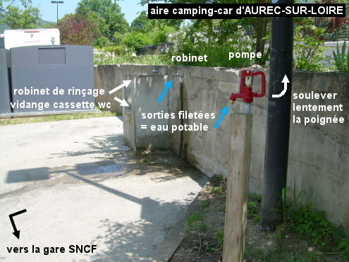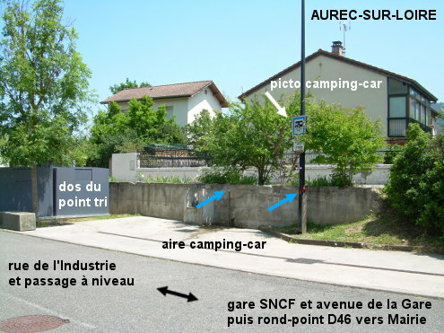 L'aire pour camping-car est implantée au milieu d'un long parking situé près de la gare SNCF (fléchée). 1) En provenance de Saint-Paul-en-Cornillon sur la D46, au rond-point avec la D45 venant à gauche de Pont-Salomon continuer tout droit dans la D46 en direction du centre-ville et de la Mairie jusqu'au rond-point suivant au bord duquel il y a la Mairie. Prendre alors la deuxième sortie qui passe à gauche de la Mairie (N.B. : Sur le parking derrière la Mairie il y a des toilettes mais dont le lavabo est inutilisable pour remplir des bidons et même pour boire) en suivant la flèche ''gare SNCF''. 1a) Tourner dans la deuxième à gauche en direction de la gare pour arriver face à celle-ci à un carrefour en T. Tourner à droite dans la voie qui dessert le parking (mais pas dans la rue des Cheminots en sens unique) pour trouver 90 mètres plus loin l'aire pour camping-car côté droit. À droite du bloc en ciment avec la trappe de vidange et le robinet de rinçage, séparé de celui-ci par le pan en ciment, il y a le robinet à sortie filetée destiné au remplissage des cuves de camping-car qui délivre donc de l'eau potable. N.B.1 : Sur ce robinet-poussoir l'eau coule en s'évasant et gicle. Encore un peu plus à droite il y a une sorte de pompe sur une haute tige avec une poignée rouge, avec une sortie filetée également. N.B. 2 : Soulever la poignée lentement et en s'arrêtant bien avant la butée pour faire monter l'eau (ce n'est pas immédiat) qui coule alors bien droit sans gicler si on a ajusté correctement le débit. 1b) Si on a loupé la suite de l'avenue de la Gare à gauche parce que la flèche est noyée dans la vigne-vierge et qu'on est alors dans la rue de l'Industrie, suivre le virage à gauche (flèche ''salle des fêtes'') puis juste avant le passage à niveau tourner à gauche dans la voie qui dessert le parking pour trouver l'aire pour camping-car côté gauche 50 mètres plus loin, juste après le point tri. 2) En provenance de Monistrol-sur-Loire sur la D47, au rond-point avec la D45 qui arrive à droite de Pont-Salomon, prendre la troisième et dernière sortie en direction du centre-ville. Puis au carrefour en T, tourner à droite et rouler tout droit jusqu'au rond-point situé devant la Mairie. Prendre alors l'avenue de la Gare qui est à gauche de la Mairie, puis même itinéraire qu'en 1b.