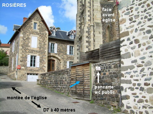 Ces toilettes se trouvent près de l'église, à 40 mètres de la D7. 1) En provenance du lieu-dit Lachaud-de-Rougeac sur la D35, face au sens interdit (tronçon de D35 en sens unique) suivre à gauche la flèche ''toutes directions'', puis suivre la courbe à droite, pour déboucher à un carrefour en T sur la D7. Tourner à droite dans la D7 puis dans la première à gauche (rue plutôt étroite qui monte). Un peu plus haut côté droit on verra fixée perpendiculairement au mur en pierres de soutènement une pancarte ''WC public'' juste avant la façade en bois sombre des toilettes en contrebas du parvis de l'église. 2) En provenance de Saint-Julien-du-Pinet sur la D28 puis la D7, au carrefour à gauche avec la D35 (tronçon en sens unique direction Le Pertuis), ne pas prendre la rue juste en face ni la suivante, mais la troisième à droite (montée de l'église) pour trouver les toilettes un peu plus haut côté droit.