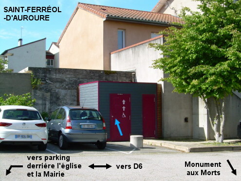 Les toilettes (fléchées) se trouvent en face de l'esplanade sur laquelle est érigé le Monument aux Morts, près d'un parking situé derrière l'église et la Mairie, à proximité d'une aire de jeux. 1) En provenance de Saint-Didier-en-Velay sur la D500 (1 km hors zone urbaine de cette route à grande circulation) puis la D6, au stop où la D6 vire à gauche, prendre la rue en face (rue Mathieu Pichon) en direction de l'église et de la Mairie. Prendre ensuite à gauche l'allée piétonne située entre l'église et la Mairie (flèche ''WC''), passer par le plan incliné à gauche des escaliers pour rejoindre le parking (il n'y a alors plus de flèche). Se diriger vers la gauche pour rejoindre la voie permettant aux voitures d'entrer sur le parking. On verra alors face à soi sur le côté gauche de la rue, le petit bâtiment des toilettes accolé au mur. C'est une cabine WC autonettoyante, avec ici un bouton-poussoir pour la commande de l'écoulement de l'eau dans le lavabo-boite. 2) En provenance de Firminy (à partir de la gare SNCF, prendre l'avenue de la Gare en face et aux feux tourner à droite en direction du Puy-en-Velay puis rouler tout droit jusqu'au quatrième rond-point où l'on passera sous la N88 en prenant la deuxième sortie et au rond-point juste après la deuxième sortie puis tout droit) sur la route de Montessus puis le chemin de Varan (petites routes tranquilles, au carrefour en T en bas d'une descente tourner à gauche) puis une autre petite route pour arriver plus loin à un grand carrefour près de Saint-Ferréol-d'Auroure. Tourner à gauche (dans la D6) pour passer sous la N88 et au rond-point juste après prendre la première sortie pour entrer dans la ville puis suivre le virage à gauche. Tourner dans la première à gauche (les flèches qui indiquent un parking et des WC publics est orientée face au sens opposé). Au sortir du virage à droite on découvrira côté gauche l'esplanade arborée avec la statue d'un Poilu et côté droit le bâtiment des toilettes accolé au mur dans un recoin (à 45 mètres de la D6).