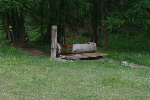 ATTENTION, fontaine pour vététistes. Fontaine en bois en lisière de forêt à une vingtaine de mètres de la piste non goudronnée menant au Queyron.