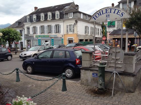 Borne située au centre de la place de la République, à côté d'une fontaine.