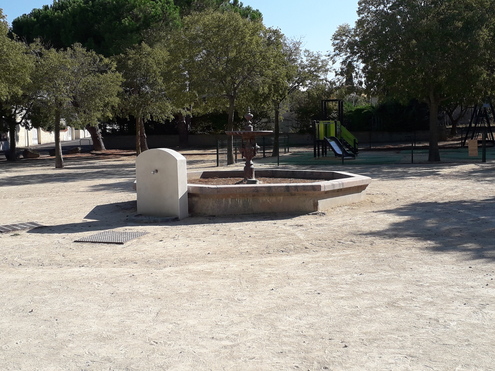 Au centre de la place Charles de Gaulle, contre la fontaine.