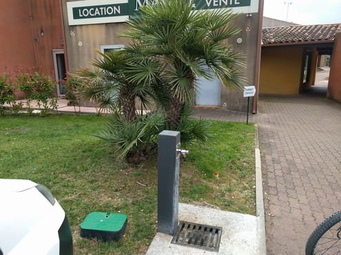 Sur le parking devant le mini centre d'activité, il y a un robinet poussoir devant l'enseigne "Location MAB"