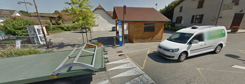 Une borne verte se trouve sur une place dans le village.