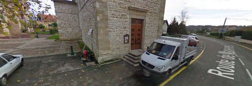 Une borne verte se trouve juste devant l'église, sur le côté gauche, le long du trottoir.