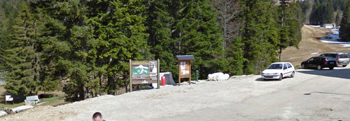 Une borne se trouve derrière les places de parking, juste avant le restaurant