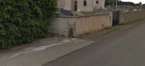 La fontaine est adossé au mur du cimetière à l'extérieur de celui-ci sur le parking du cimetière