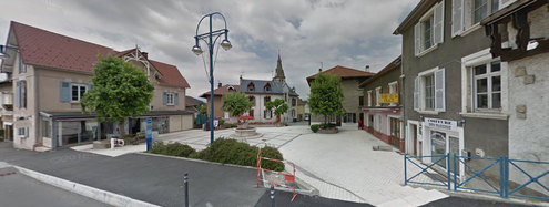 Au centre de la place du village. Écriteau "Eau potable" bien visible.