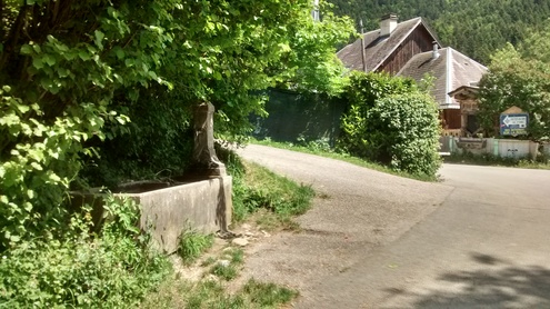 En haut du parking du foyer de ski de fond, prendre la route à droite et juste avant l'intersection, la fontaine est sur la gauche.