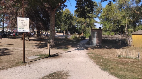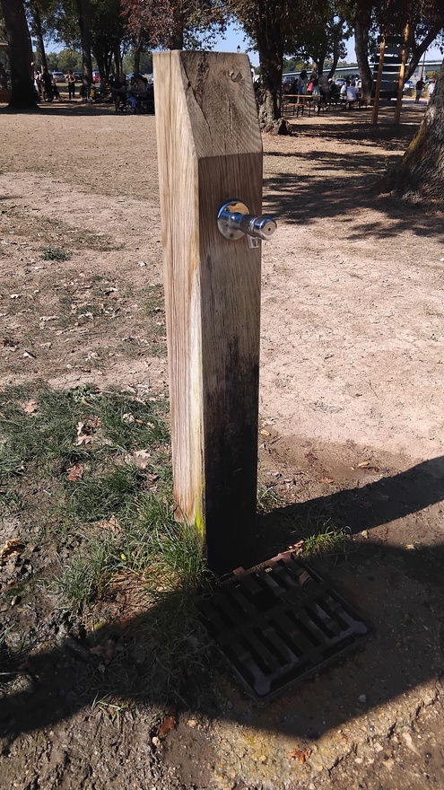 Robinet placé sur un poteau en bois situé au niveau de l'intersection de deux chemins, dans le parc de la Paix. Des toilettes sèches et un petit parking se trouvent à proximité.