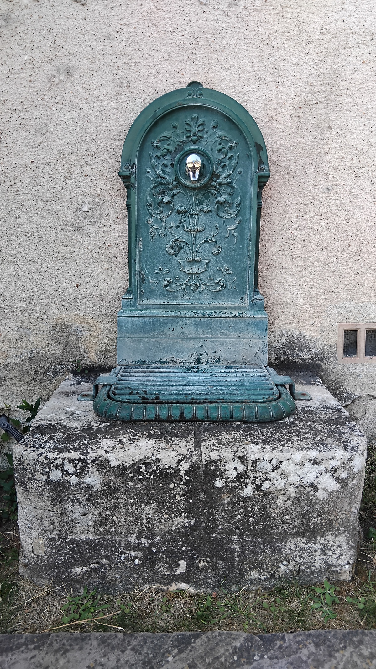 Robinet placé sur une plaque ornementale et situé contre le mur arrière de l'église de Lestiou. De l'autre côté de ce mur se trouvent aussi des toilettes publiques (avec un robinet) intégrées dans le bâtiment. Le lieu est facilement accessible depuis la Grande rue, mais peut aussi l'être par des petits escaliers depuis le chemin en contrebas longeant la rivière s'appelant le Lien.
