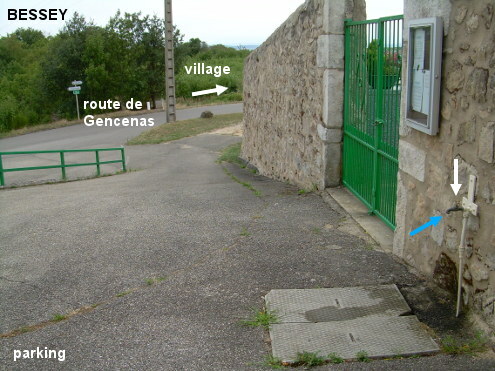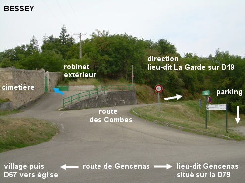 Le cimetière est situé en dehors du village à côté de la route menant au lieu-dit Gencenas et qui débute près de l'église, à 385 mètres de la D67. 1) En provenance de Lupé sur la D67, juste après l'église érigée côté gauche, tourner à droite dans la ''route de Gencenas''. Environ 250 mètres après le panneau de fin de village, tourner à gauche dans la courte allée qui monte vers le cimetière (son portail fait face au sens opposé de circulation) et qui est au début de la petite route menant au lieu-dit Les Combes. Le robinet est à l'extérieur à droite du portail. 2) En provenance de Pélussin sur la D79, au lieu-dit Gencenas tourner à droite en direction du village. Beaucoup plus loin (1,7 km), juste après un parking en terre battue côté droit tourner à droite et prendre aussitôt l'allée qui monte vers le cimetière dont le portail nous fait face. 3) En venant de Pélussin sur la D19, au lieu-dit La Garde on peut prendre un raccourci : juste après la borne du point km 16 tourner à gauche en direction du lieu-dit Bourbouray, traverser celui-ci puis le lieu-dit Les Combes, pour déboucher à un carrefour en T sur la route de Gencenas. L'allée desservant le portail du cimetière est ici à droite : tourner en épingle et monter (anticiper au niveau du braquet !) jusqu'au portail pour trouver le robinet à l'extérieur à sa droite.
