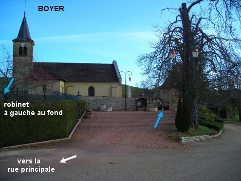 Le cimetière est situé dans l'enceinte autour de l'église. A partir de la D39, prendre la direction de Boyer, juste après le panneau de début du village et avant la Mairie, tourner à gauche et prendre l'allée immédiatement à gauche. Le cimetière est à 60 mètres de la route principale qui traverse le village. Le robinet est à l'intérieur du cimetière, à gauche plus loin dans le coin.