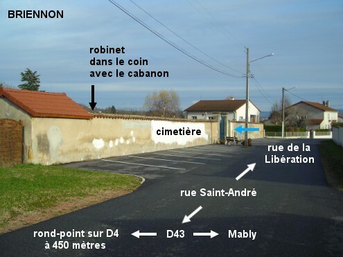 Le cimetière est situé à 200 mètres de la D43. A partir du rond-point D4 / D43, prendre la D43 en direction de Mably, tourner à gauche lorsque l'on voit pour la deuxième fois les panneaux indiquant le centre-ville et la Mairie (450 mètres après le rond-point). On est alors dans la rue Saint-André et le cimetière est implanté côté gauche 200 mètres plus loin. Le robinet est à l'intérieur du cimetière, à gauche du portail, plus loin à côté du cabanon qui est dans le coin. N.B.: Si l'on arrive de la Bénisson-Dieu par la D35 puis un petit bout de D43, la rue Saint-André est la deuxième à droite après le panneau marquant le début de la ville (suivre les flèches ''centre-ville'' et ''Mairie''). Si l'on continue dans la rue Saint-André, on arrive sur la rue de la Libération qui à gauche finit par déboucher sur la D4.
