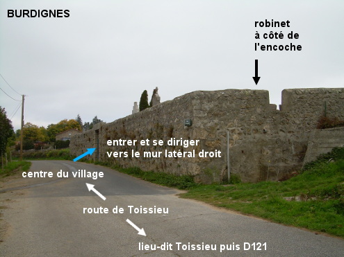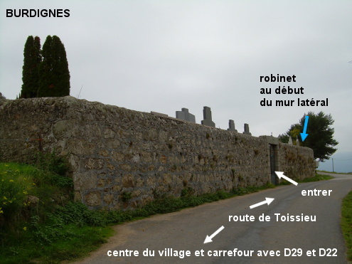 Le cimetière (fléché) se trouve dans une rue secondaire à 390 mètres de la D29 près de son carrefour avec la D22. Le robinet est à l'intérieur du cimetière, au début du mur latéral droit. 1) En provenance de Saint-Sauveur-en-Rue sur la D22, au stop du carrefour avec la D29 tourner à gauche puis aussitôt à droite après l'obélisque, en direction du cimetière (cf avant-dernière flèche d'une série orientée face au sens opposé de circulation) dans cette rue au début très large. Ensuite suivre le virage à droite et rouler tout droit jusqu'au cimetière implanté côté gauche. Entrer dans le cimetière. N.B. : Il faut pousser fort le portail dont les deux battants frottent l'un sur l'autre et qui coulisse très mal sur ses gonds. Avancer de quelques pas pour sortir du creux face au portail puis monter à droite sur l'allée plane en surplomb (dans l'herbe) qui mène au mur latéral droit, pour trouver le robinet à droite de l'encoche dans le mur et près du coin (à 30 mètres du portail). 2) En provenance de Villevocance sur la D121 (direction Annonay) puis la voie C4 (la flèche est orientée face au sens opposé) en direction du lieu-dit Toissieu, après celui-ci et juste après le panneau de début de village on verra le cimetière implanté côté droit (portail à 60 mètres du panneau).