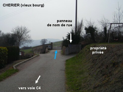 Ce cimetière est implanté au fond d'une impasse dans le vieux bourg de Chérier, non loin de l'église. 1) En provenance de la Croix Trévingt par la D41 puis la voie C1, juste après l'église tourner à droite (il y a un panneau sens interdit sauf riverains) et aussitôt à gauche pour prendre la rue en impasse qui conduit au cimetière 175 mètres plus loin. Le robinet est à l'intérieur du cimetière, vers l'extrémité du mur de gauche vers le fond, à gauche d'un portillon (qui donne sur un chemin de terre) au bout d'une allée sablonneuse d'environ 30 mètres. 2) En montant sur le vieux bourg en provenance des Moulins par la voie C4, c'est 195 mètres après le panneau de début de village qu'il faut tourner à gauche pour prendre la rue complètement à gauche qui mène au cimetière. N.B. : La route principale qui traverse le village (voie C1 puis voie C4 après un carrefour) s'appelle aussi ''rue du Vieux Bourg'' comme l'impasse menant au cimetière à proximité duquel il y a un panneau avec ce nom.